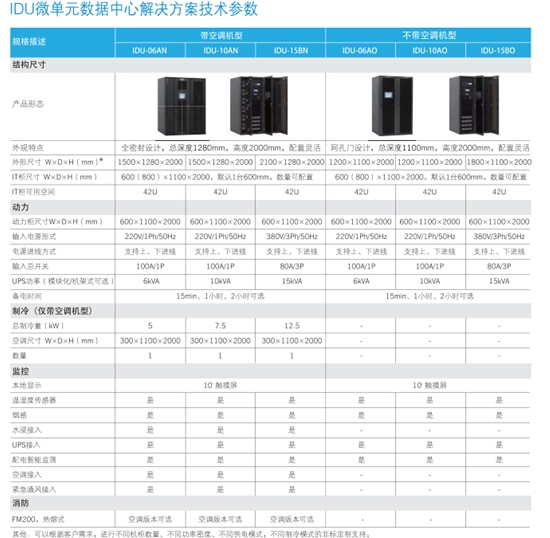 •一体化集成小型模块化数据中心,集成了IT主机柜(集成UPS、蓄电池、配电、监控)、精密空调;